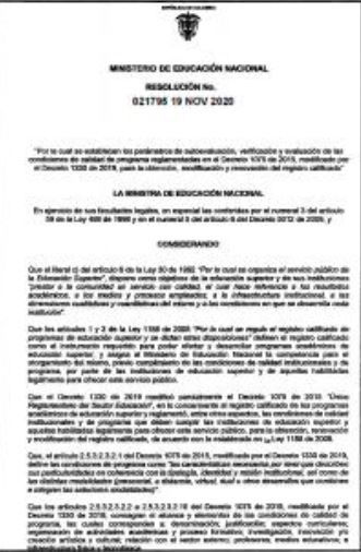 Remitimos en adjunto la Resolución N°21795 del Ministerio de Educación Nacional referida a los parámetros de autoevaluación, verificación y evaluación de las condiciones de calidad de programa reglamentadas en el Decreto 1075 de 2015, modificado por el Decreto 1330 de 2019, para la obtención, modificación y renovación de Registro Calificado.